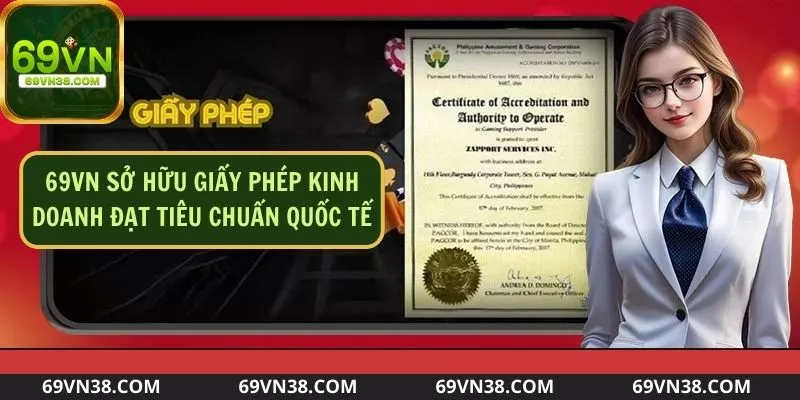 Nhà cái 69VN đã khẳng định uy tín và sự minh bạch của mình thông qua việc sở hữu các giấy phép hoạt động quan trọng từ các cơ quan quản lý quốc tế uy tín, đảm bảo môi trường cá cược công bằng và an toàn cho người chơi.